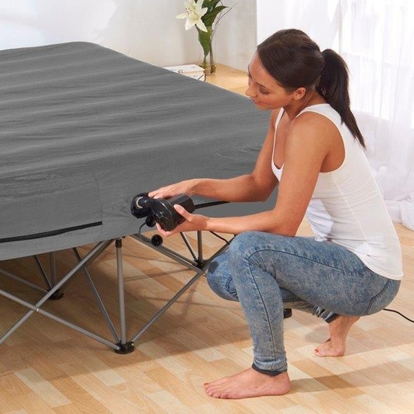 This double mattress is ideal for guests and camping trips, with its easy-to-assemble steel frame that takes up little room in the bedroom cupboard. A pump and carry bag ensures that the polyester mattress can be inflated and stored away, or transported to holiday destinations.
