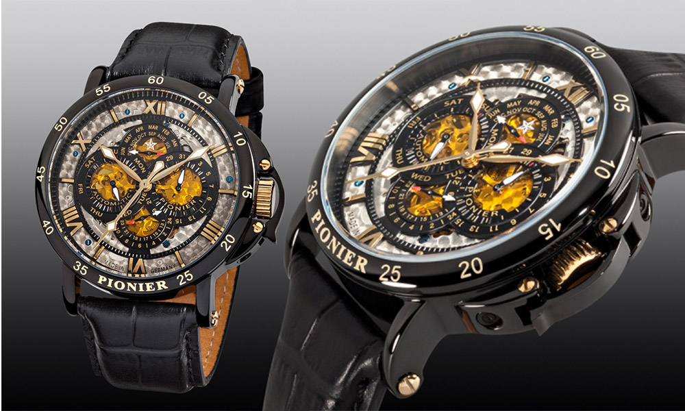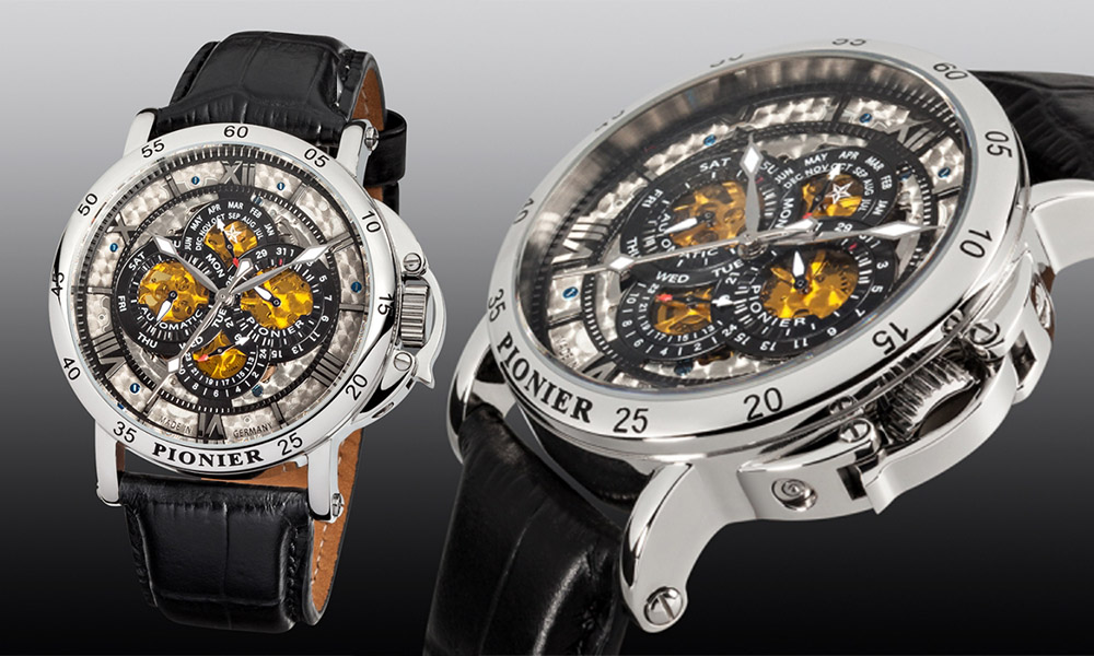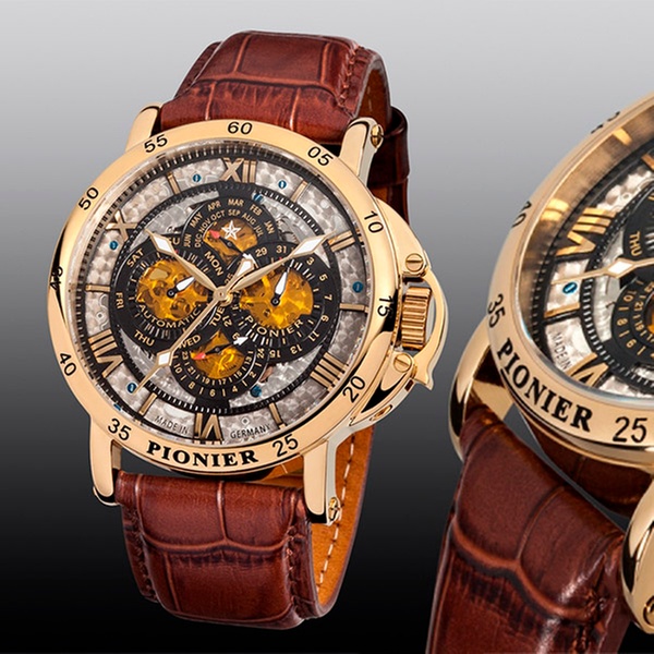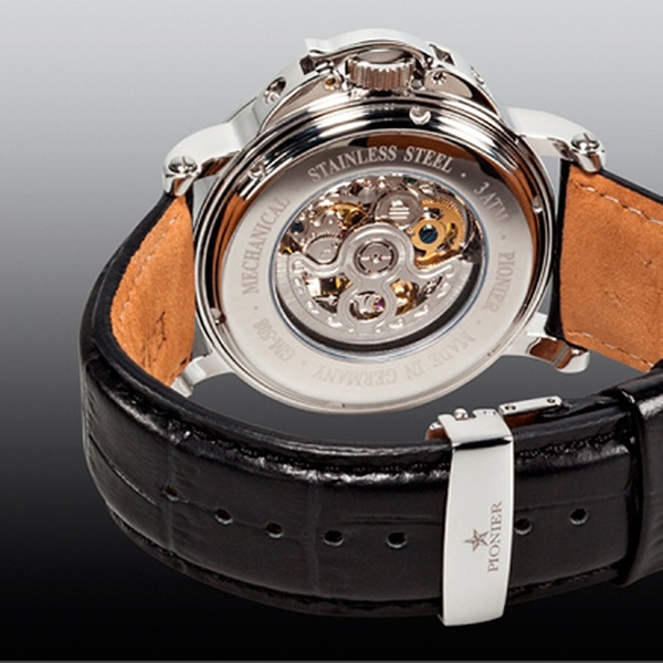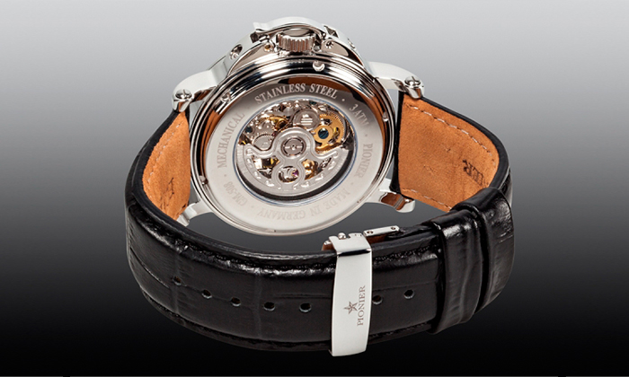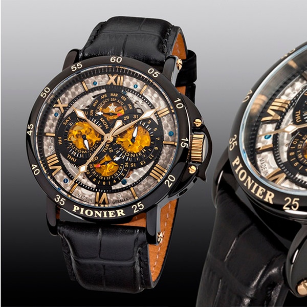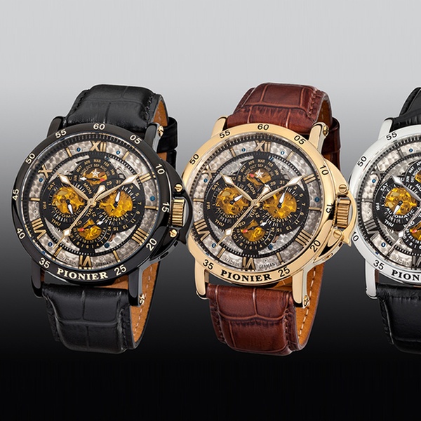These watches have a semi-skeleton design to showcase some of the intricate workings of the automatic movement clock. The face, topped with hardened mineral glass, is secured with stainless steel hardware onto an Italian leather butterfly strap. Matching style with practicality, the watches are waterproof to 3ATM and come enclosed in an original Pionier box, with warranty card and manual.