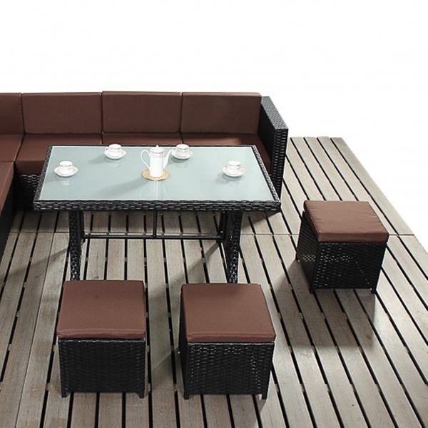 - Includes a large corner sofa, glass topped-dining table and three footstools
