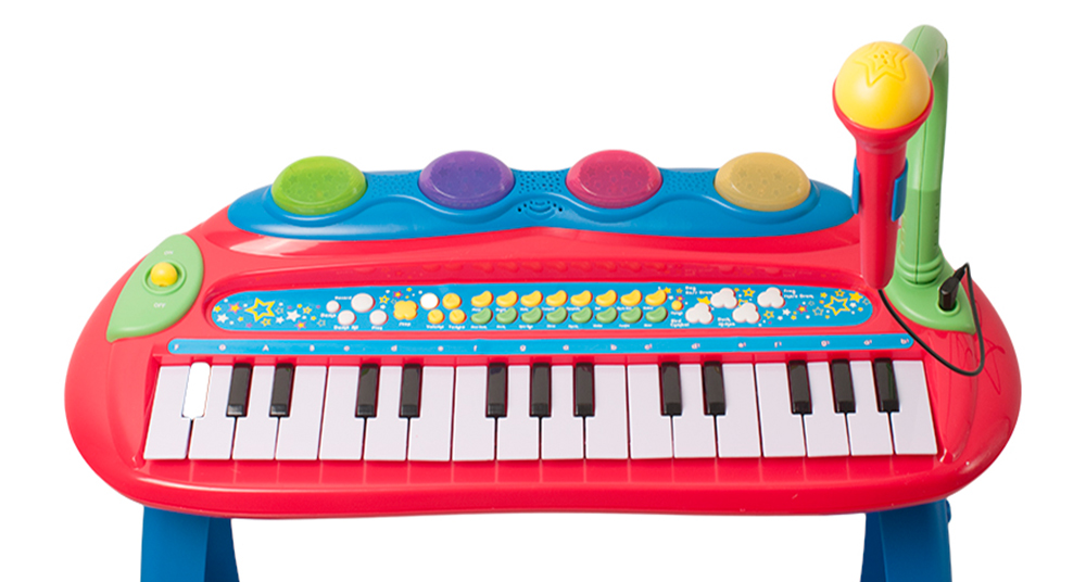 Equipping little music stars with the essentials, this toy instrument set features a 31-key keyboard, microphone, adjustable microphone stand and matching stool. The keyboard has demo songs, drum pads and different instrument sound effects, all accompanied by colourful and flashing-light effects.