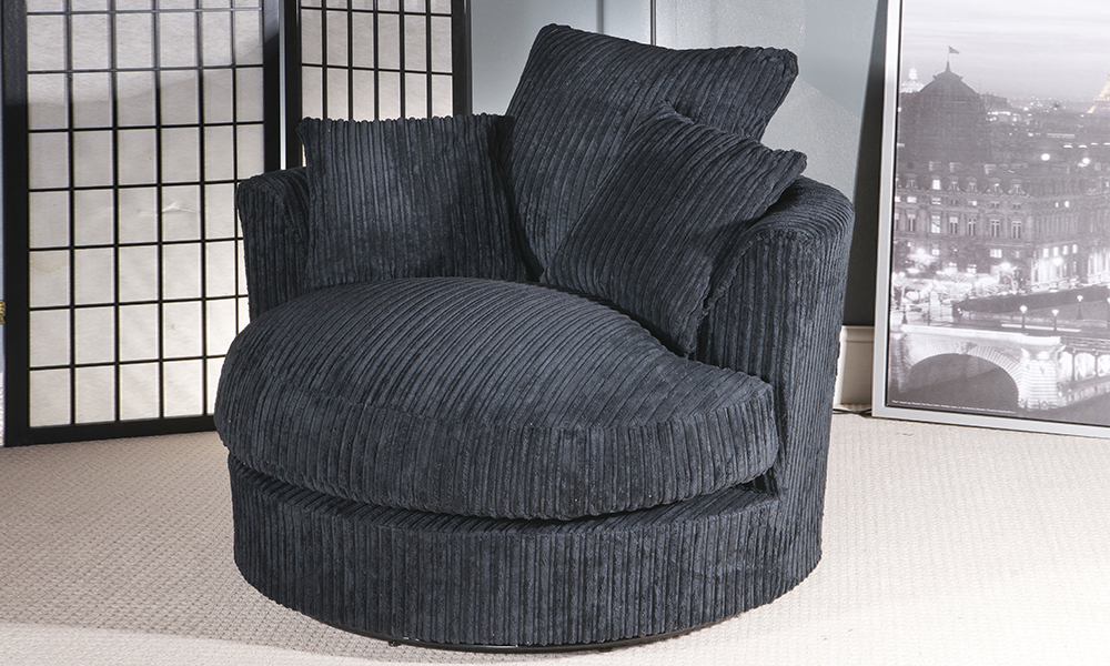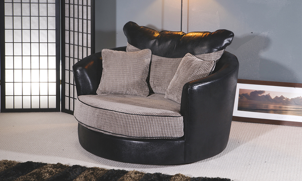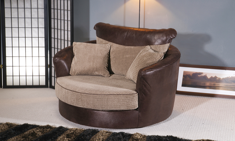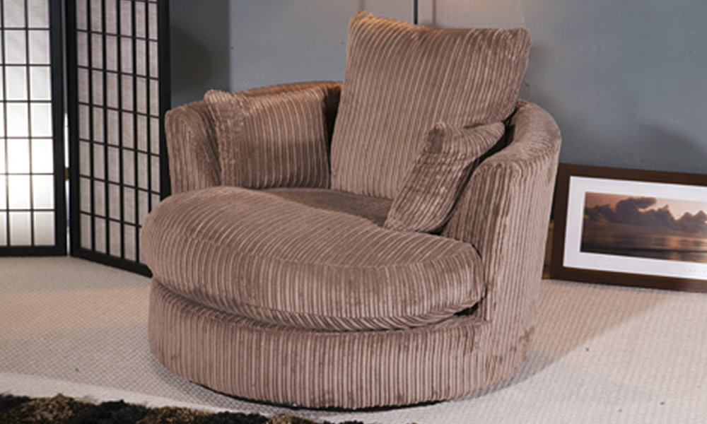 These jumbo circular chairs have a swivel mechanism, and large plush cushions for added comfort. Available in cord or cord and leather effect, there is a choice of neutral colours to suit a range of classy interiors.