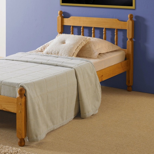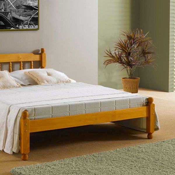 Finished in honey pine, this solid frame features an elegant headboard and a slatted base; a memory foam mattress and pillows can be added