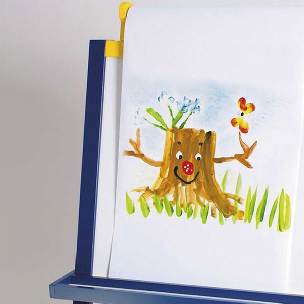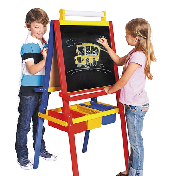- Double-sided, kid-sized art easel includes a dry-wipe board, blackboard for chalk, paper-roll holder, white paper roll, pen tray on each side of the board and 3 handy storage boxes