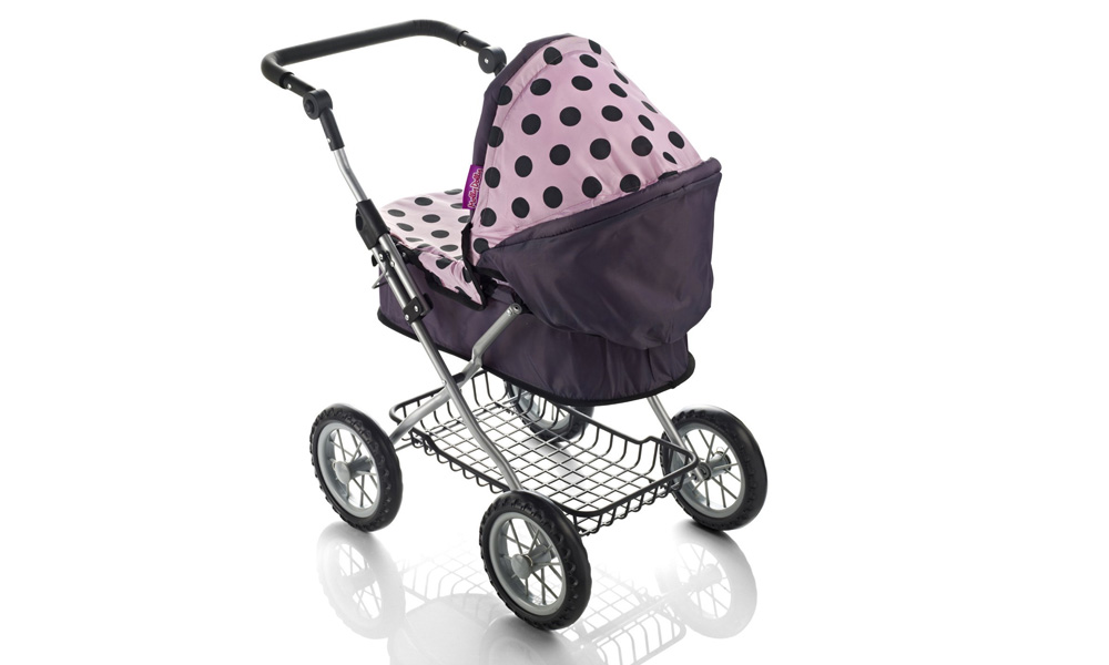 With these Molly Dolly deluxe four-wheel prams, little ones can take their dolls for a stroll. Made with a cute pink and grey polka dot design, the pram features a pullover hood, a handy changing bag and storage space underneath for holding accessories. It’s crafted with an extra strong steel chassis and a padded handle for comfort, and after use it collapses down for easy storage.