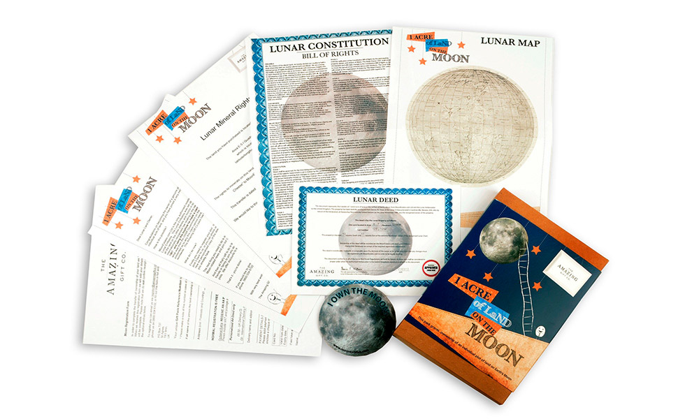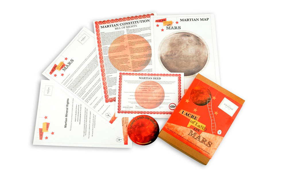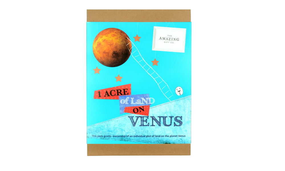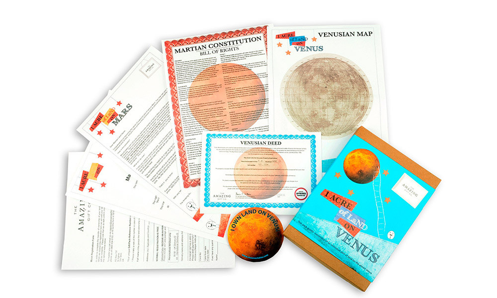 - An acre of land on the Moon, Mars or Venus with gift pack