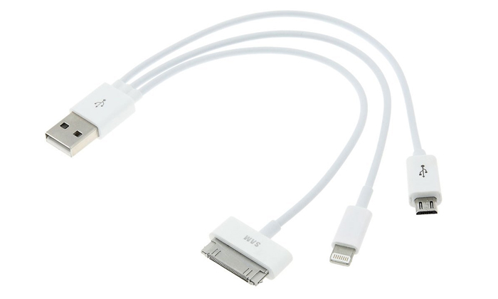 This 3-in-1 USB charger restores battery life to devices like smartphones, MP3 players and tablets. The cable splits into three, with ends to fit 30-pin, 8-pin lightning or MicroSD connectors, allowing devices to be synced and charged at the same time.