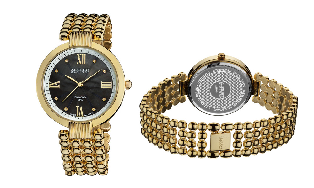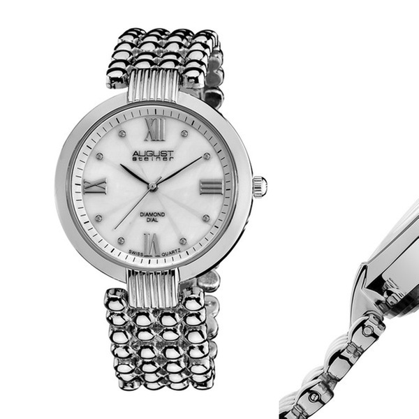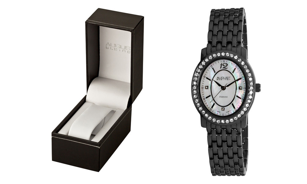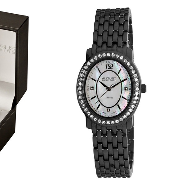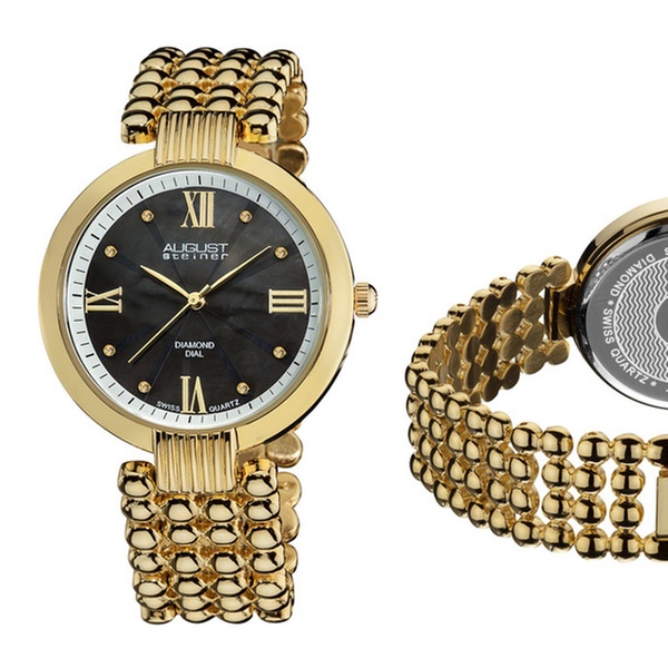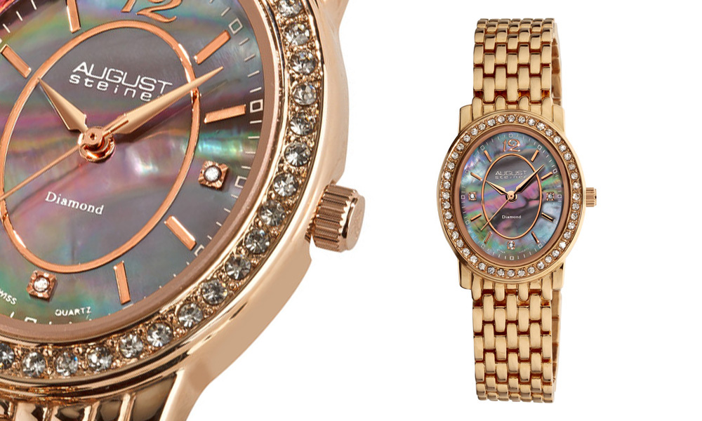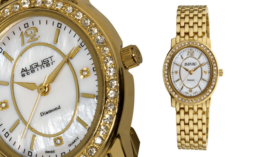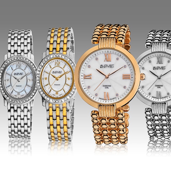 These stylish August Steiner watches will add a touch of sparkle and elegance to any wrist. They come in crystal accented or diamond marker designs and colours include black, silver and gold, depending on design. Each timepiece features quartz movement and a mother of pearl face.