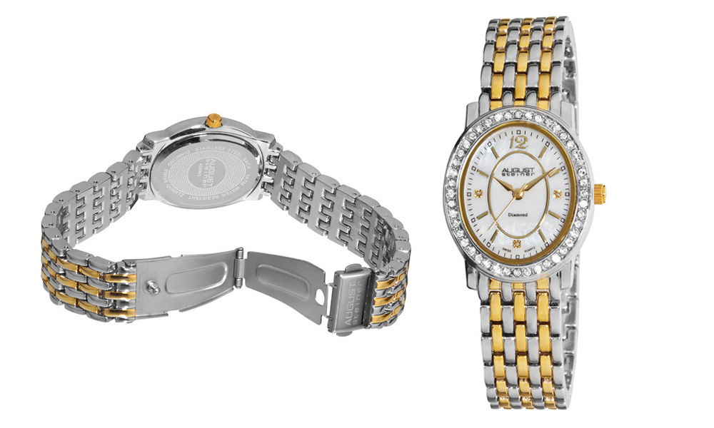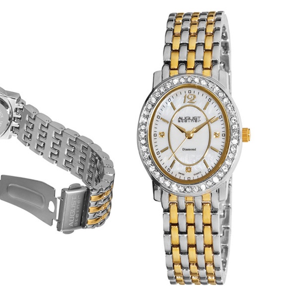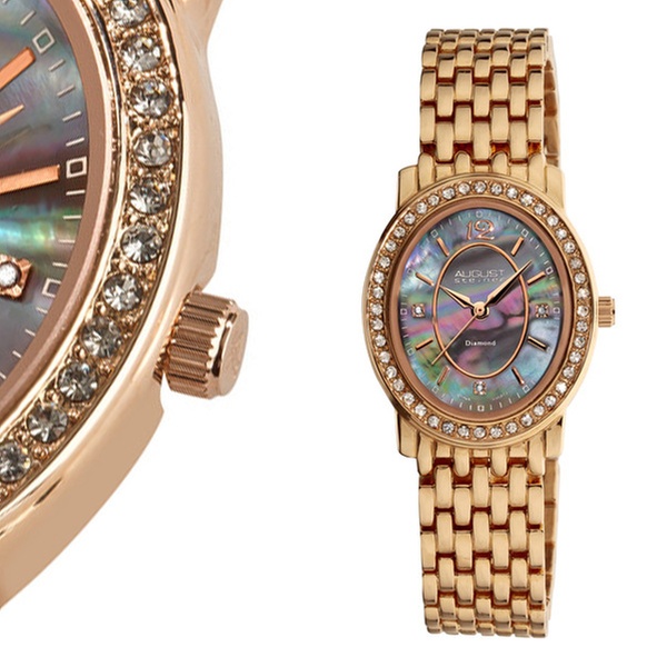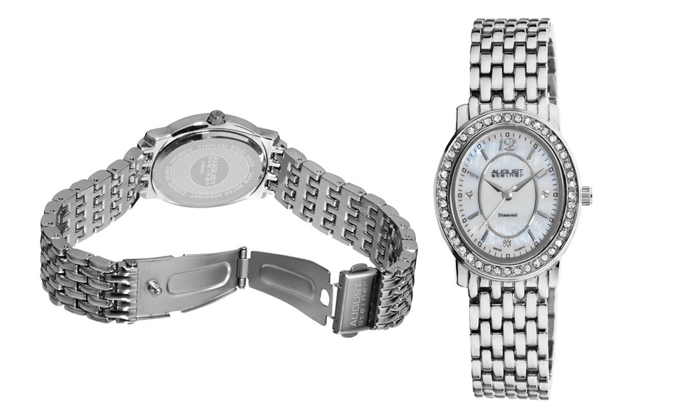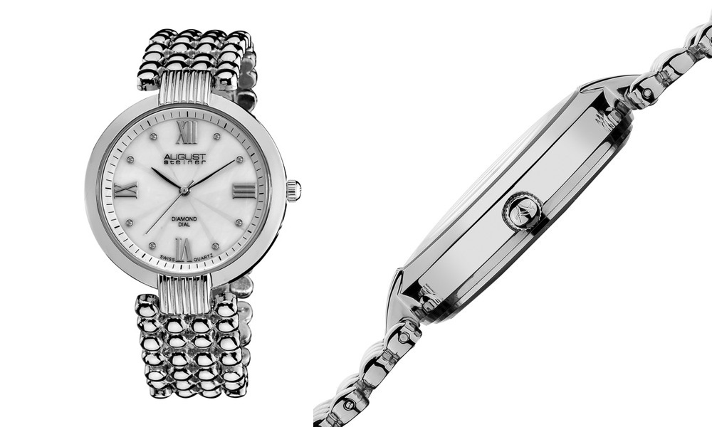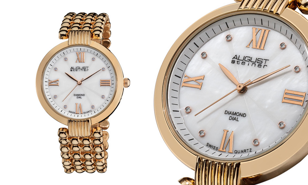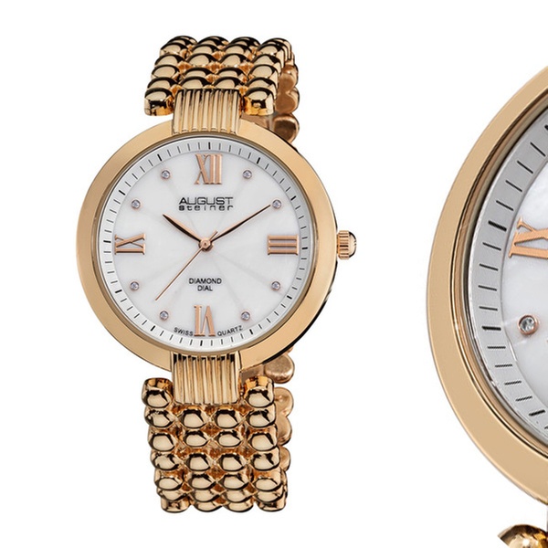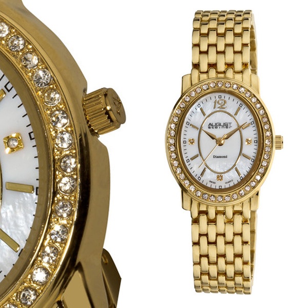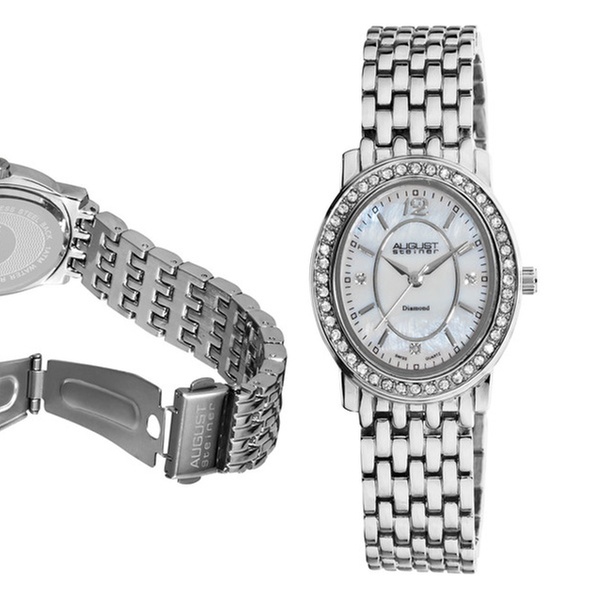 These stylish August Steiner watches will add a touch of sparkle and elegance to any wrist. They come in crystal accented or diamond marker designs and colours include black, silver and gold, depending on design. Each timepiece features quartz movement and a mother of pearl face.