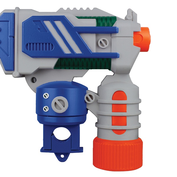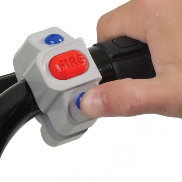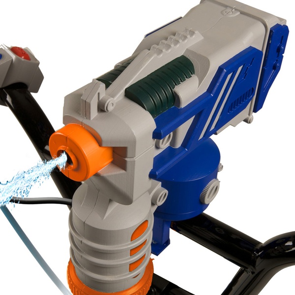 - Press the handlebar-mounted buttons and the motorised blaster will turn 180 degrees left and right
