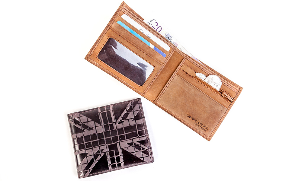 Simplistic and smart, these leather wallets from Corder London are large enough for cards and money, yet slim enough to remain discreet. In addition to the two compartments for notes and inner pockets on either side, the plain leather design includes six credit card slots, while the Union Jack option contains three, supplemented by a zipped coin pocket and photo window.