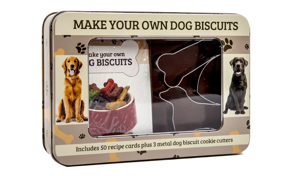 Includes 50 recipe cards, plus three metal biscuit cutters shaped as a dog, bone and heart, in a tin gift box