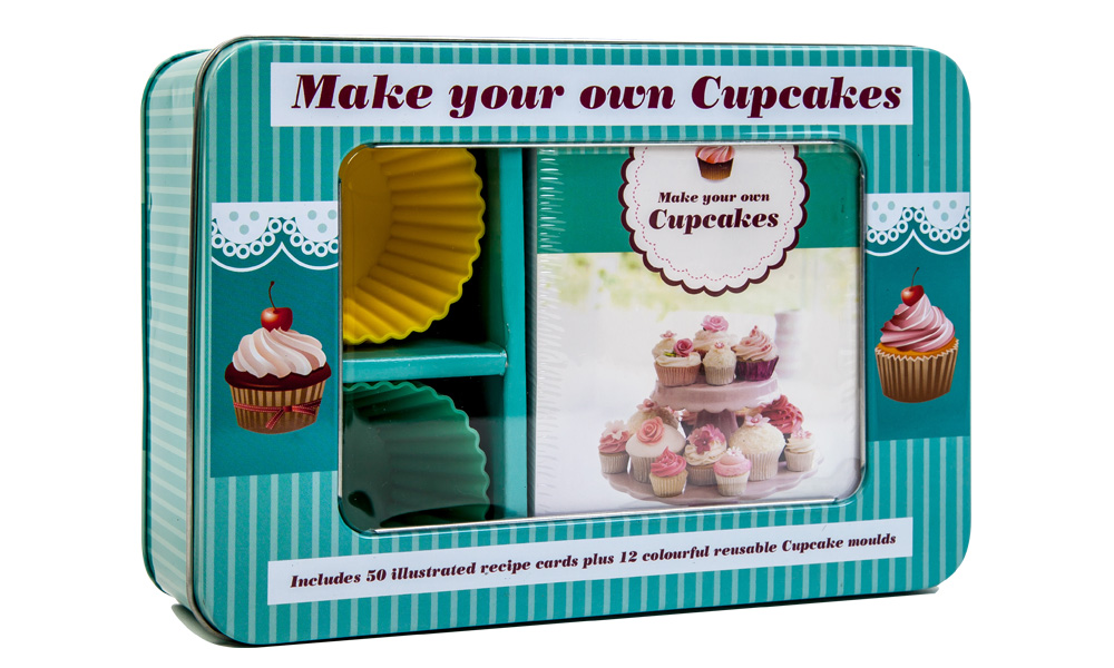 Includes 50 illustrated recipe cards, plus 12 coloured reusable cupcake moulds in a presentation tin
