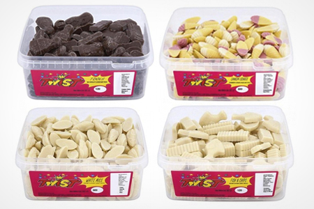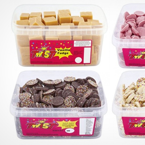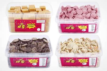 Opening up a large tub of Twist will reveal approximately 1.25 kg of favoured sweets from a choice of eight types. Each Twist tub contains 120 pieces of Porky Pigs, White Disco Discs, Fish'n'Chips, White Mice, Vanilla Fudge, Candy Cones, Assorted Tools or Disco Discs. Those unable to decide on a favourite sweet can select a combination of four Twist tubs.