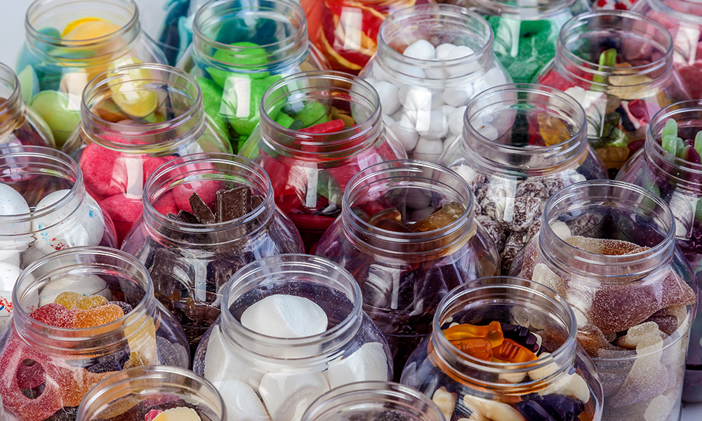 - One litre of unwrapped sweets presented in decorative jar