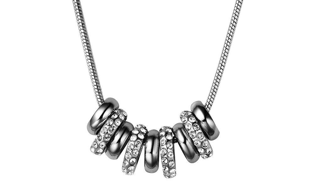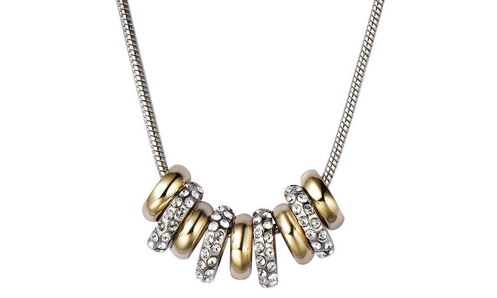 These striking necklaces are adorned with rings of various colours and sizes for a unique look. The rings are embellished with crystals made with SWAROVSKI ELEMENTS and dangle gracefully from a 43cm chain to give the décolletage an enviable sparkle.