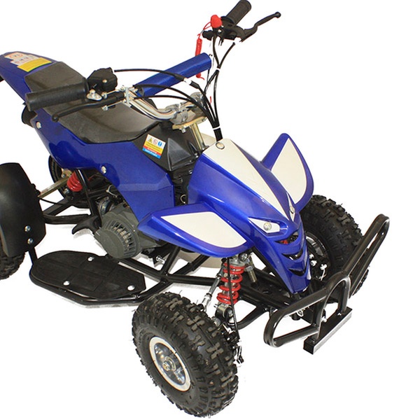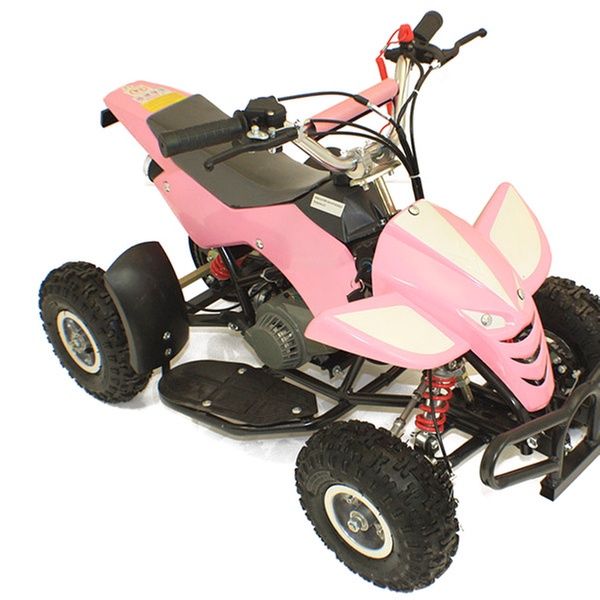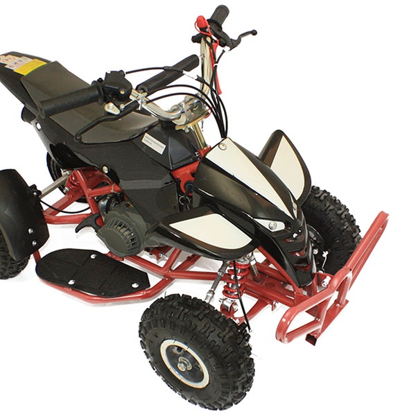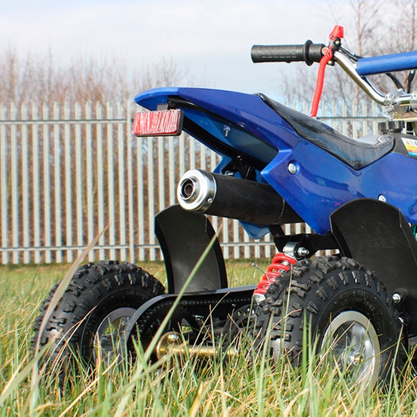 Designed for adults and children over the age of 14, the quad bike has chrome handlebars and a fully enclosed chain for safety