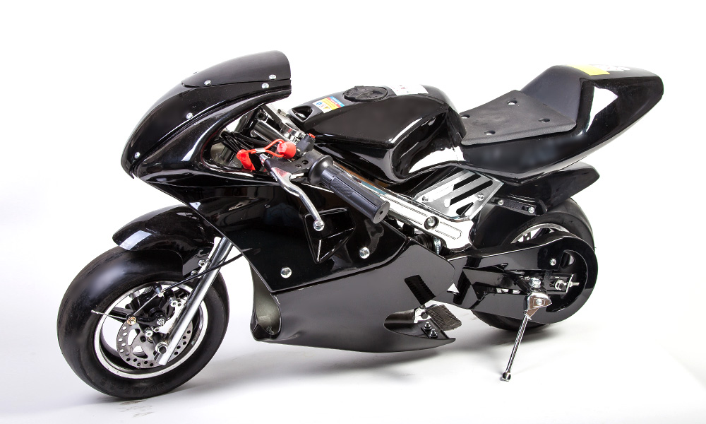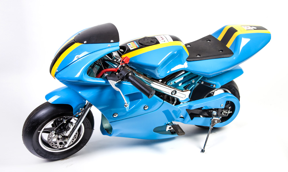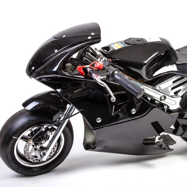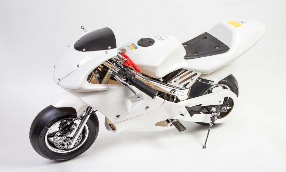 These mini motorbikes have an automatic two-stroke petrol engine and are made from high stress steel