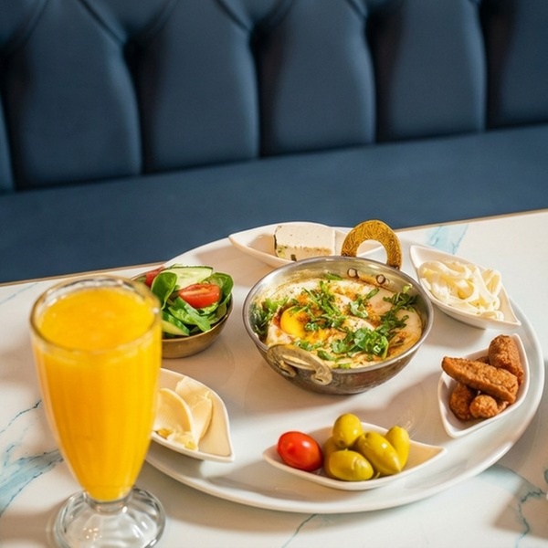 Teste Special – Shakshuka with eggs and tomatoes served with Turkish cheese, sausage, olives, halwa, and Arabic bread