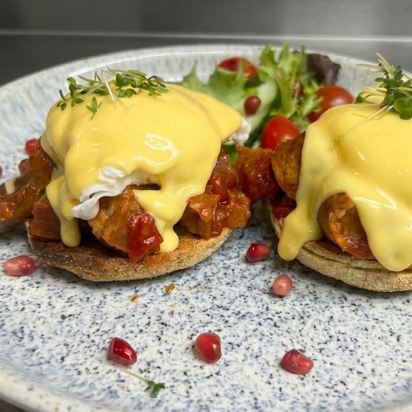 Eggs Mexican – Sausages, salsa eggs and hollandaise sauce on toasted brioche bread