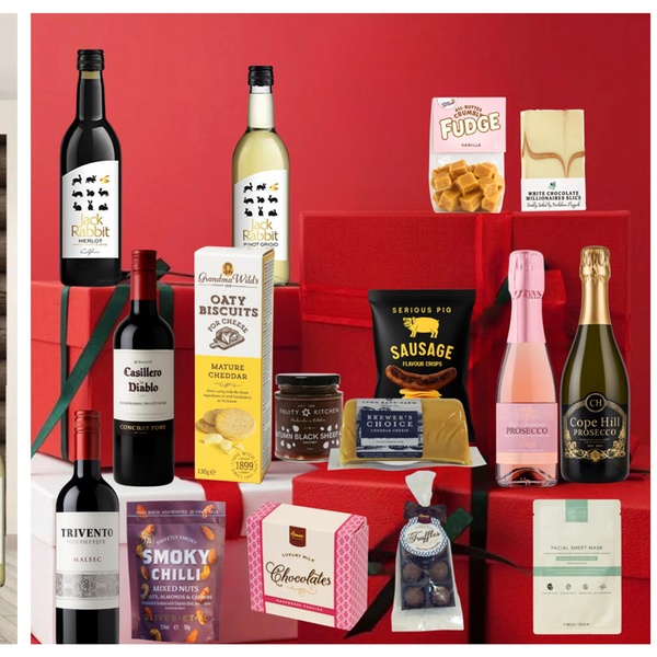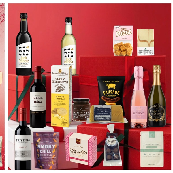 Each hamper is carefully paired with a premium alcoholic beverage such as red wine, white wine, Rosé Prosecco, or Pink Gin & Tonic, complementing the contents of the box.