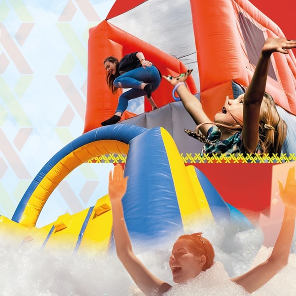 A family of four can spend the afternoon running, jumping and bouncing up and down on the inflatables