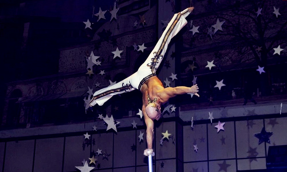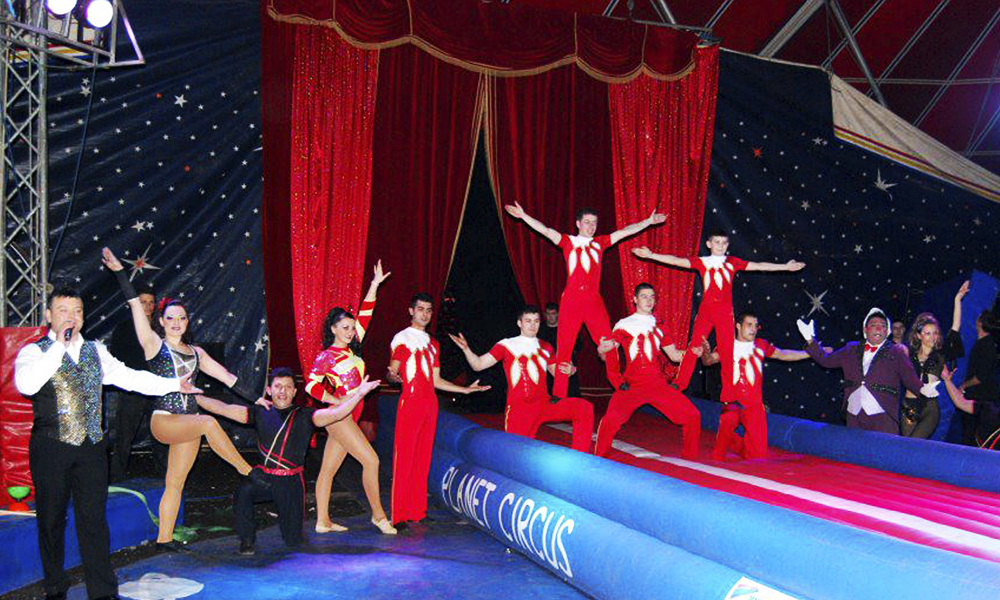 Alive with spectacle and derring-do, Planet Circus unleashes a frenzy of acrobatics, trickery and other improbable feats beneath the vaulted ceiling of its big top. Kenyan Warriors slice through the air, and motorcyclists roar around the Globe of Death. Miss Emilia floats on an aerial rope while trapeze artists swing high overhead. Trampoline wrestlers, clowns and magicians exercise their dexterous skills, before a prince of balance attempts to pull a handstand atop a towering stack of chairs.