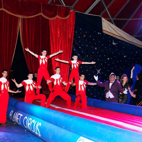 Alive with spectacle and derring-do, Planet Circus unleashes a frenzy of acrobatics, trickery and other physics-defying feats beneath the vaulted ceiling of its big top. Kenyan Warriors slice through the air and motorcyclists roar around the Globe of Death. Miss Emilia floats on an aerial rope while trapeze artists swing high overhead. Trampoline wrestlers, clowns and magicians exercise their slippery skills, before a prince of balance attempts to pull a handstand atop a towering stack of chairs.