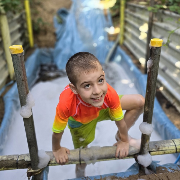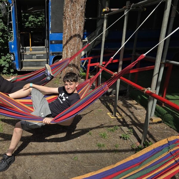 In the main area we have a battle bus, a 15ft swimming pool, hammocks, hanging tents, a toddler play area, seating areas, music, hot/cold drinks, and snacks. There is so much to do.