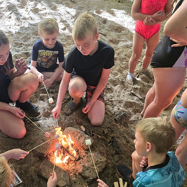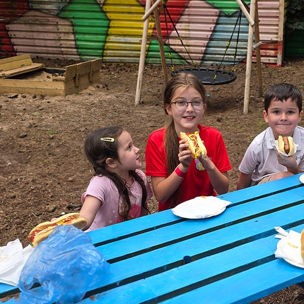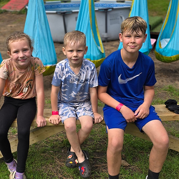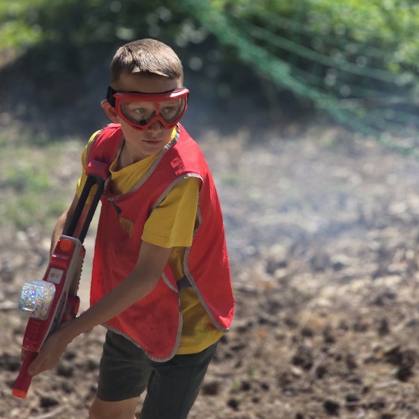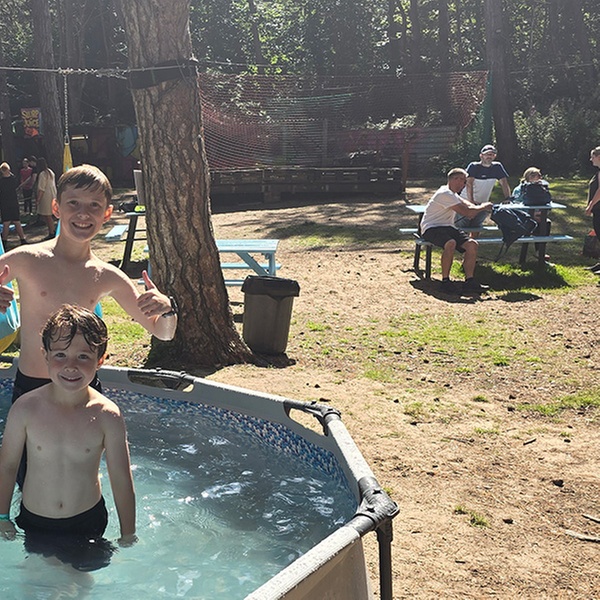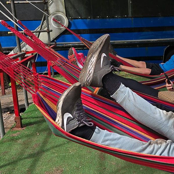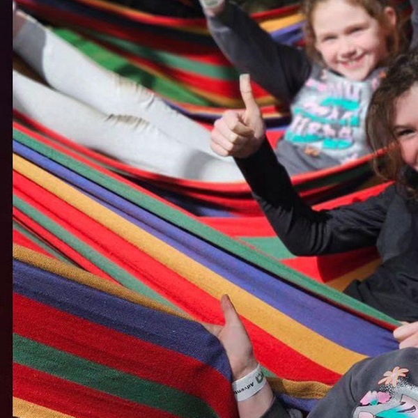 • In the main area, we have a battle bus, a 15ft swimming pool, hammocks, hanging tents, a toddler play area, seating areas, music, hot/cold drinks, and snacks. There is so much to do.