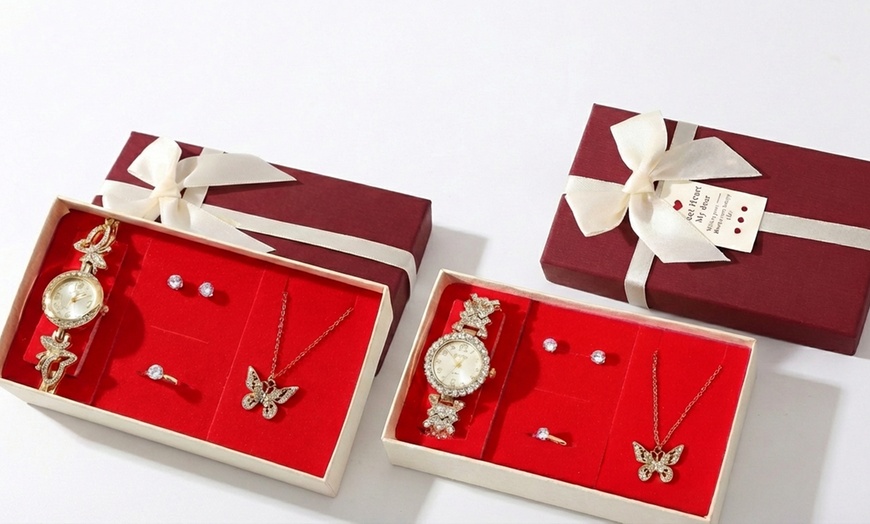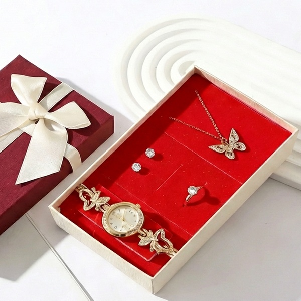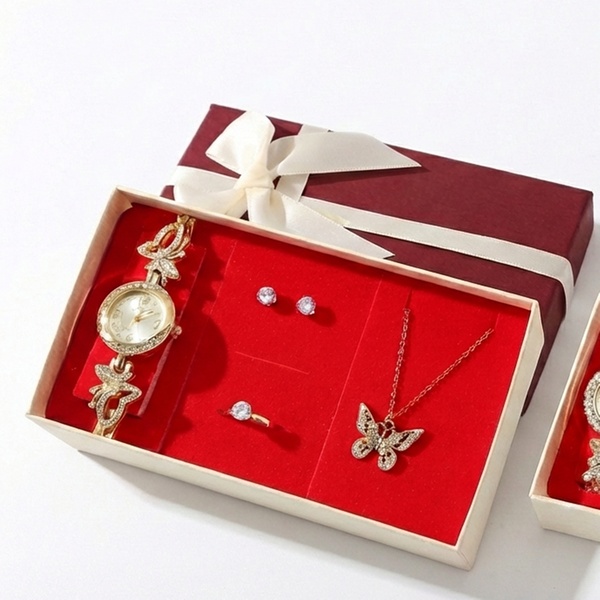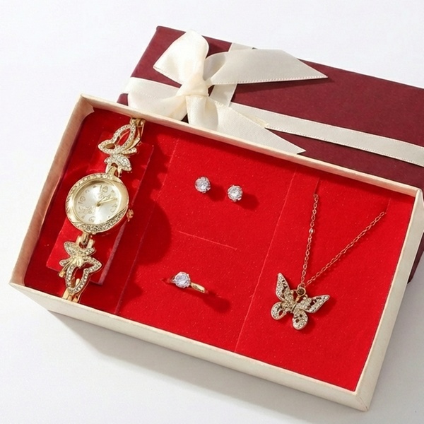 - Complete five-piece set including watch, necklace, ring, stud earrings and matching gift box