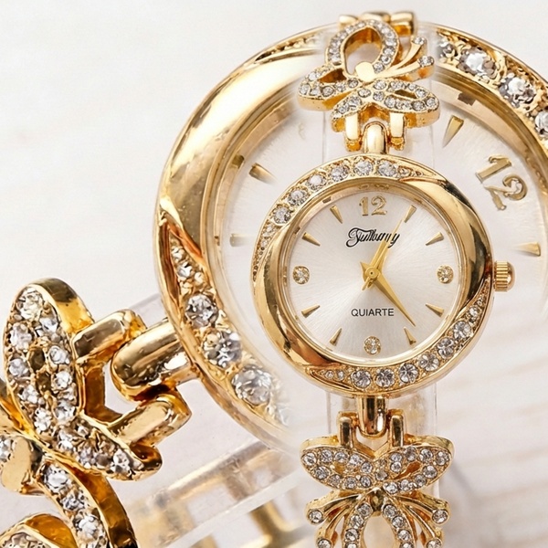 An elegant gold tone watch and jewellery gift set featuring a coordinated five-piece design with rhinestone accents, ideal for everyday wear or special occasions