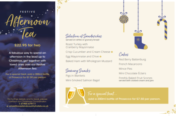 - Selection of cakes: red berry Battenburg | French macaroons | mince pies | mini chocolate eclairs | freshly baked fruit scones served with clotted cream and jam