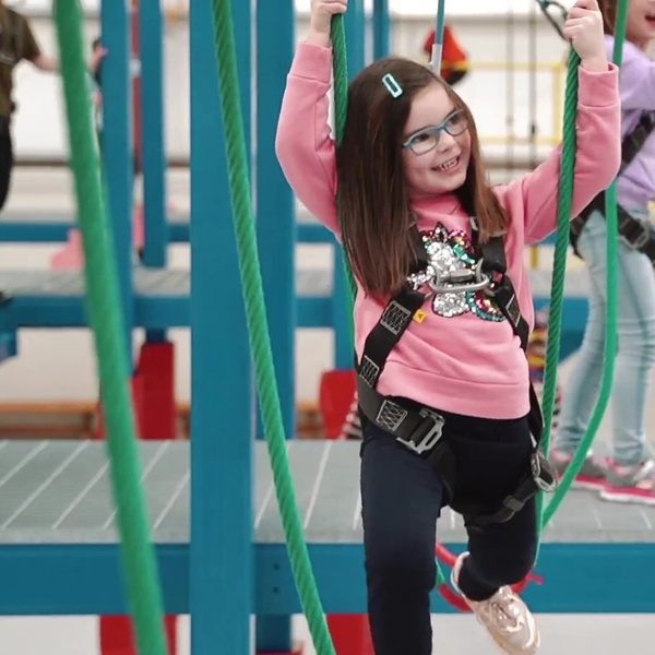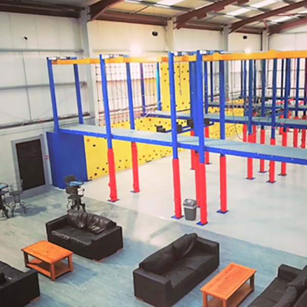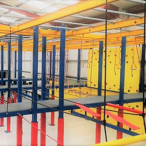 - 18 obstacle course: Burma bridge | swinging logs | wobble boards | climbing wall traverse | cargo net | swinging V ropes