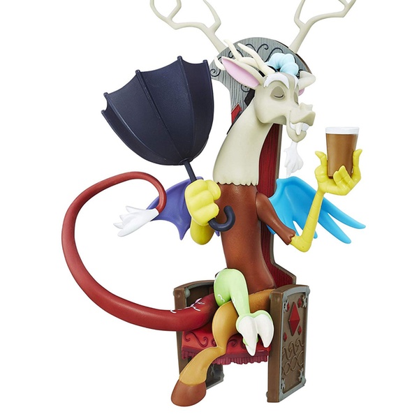 - Discord is featured sitting on a removable throne with legs crossed, enjoying a cup of hot chocolate in one hand with an inside-out umbrella in the other