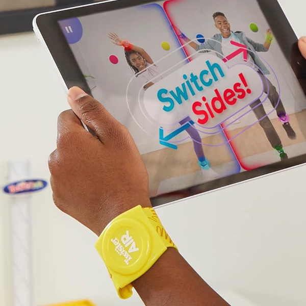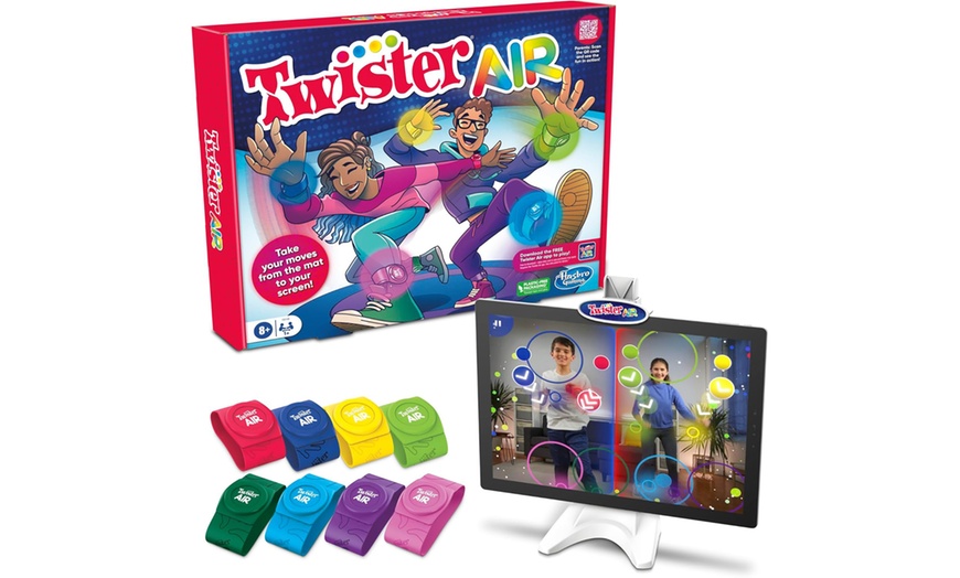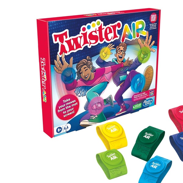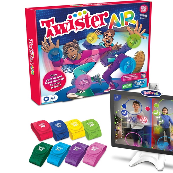 App-enabled Twister Air game where players use colourful wrist and ankle bands to match on-screen spots via the free app, suitable for ages 8+, with all accessories included