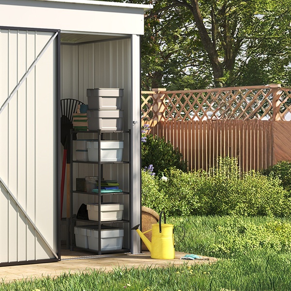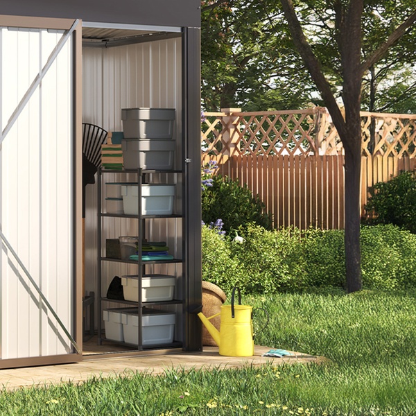• Package contents: 1 storage shed, 4 ground nails, 2 hooks, and 1 shelf