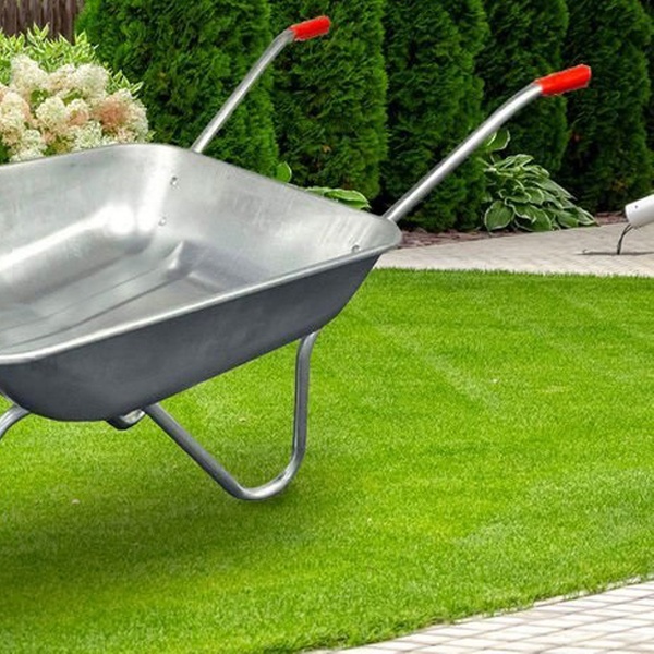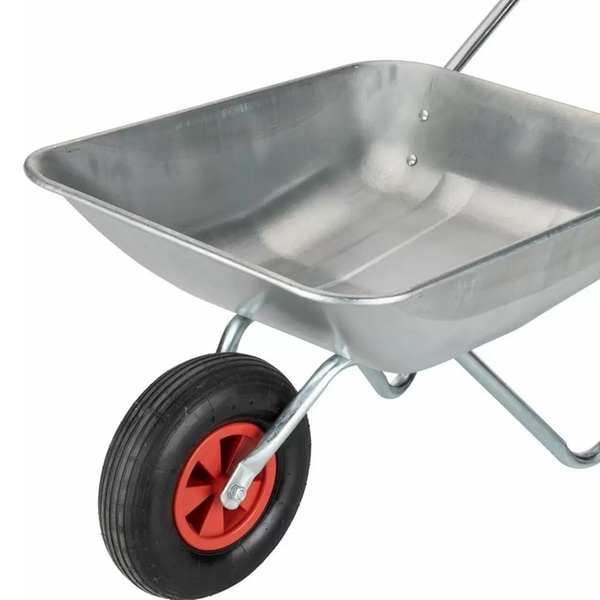 This heavy-duty metal wheelbarrow features an 65L capacity, a sturdy pneumatic front wheel for smooth movement, and ergonomic handles for a secure grip, making outdoor hauling tasks effortless