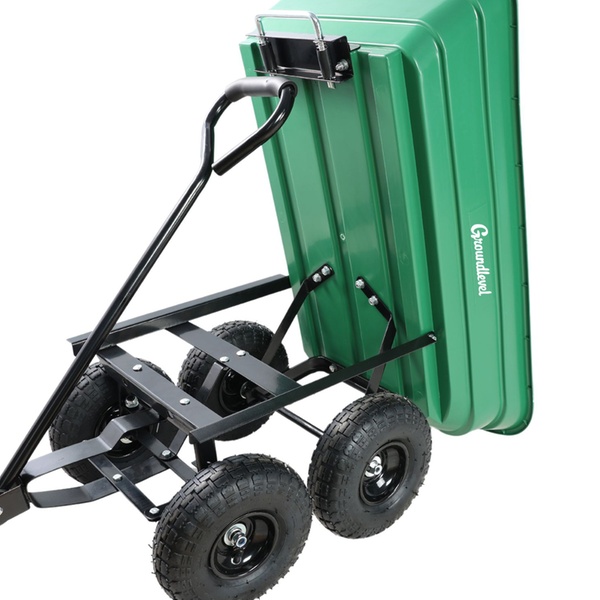 This heavy-duty cart features a strong steel frame, durable plastic bowl, pneumatic wheels for smooth terrain handling, a quick-release tipping mechanism for easy unloading, and a padded ergonomic handle for a comfortable, secure grip
