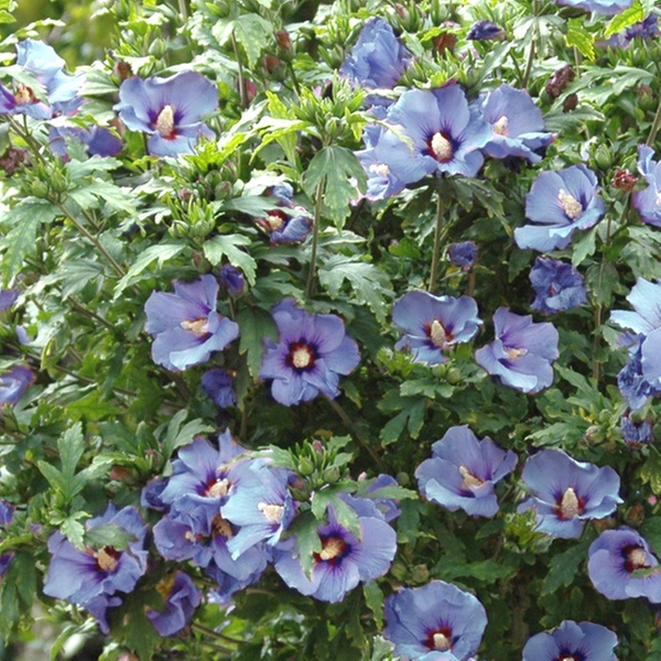 Boasting stunning lavender-blue flowers with deep crimson centres, this hardy shrub adds vibrant colour from late summer