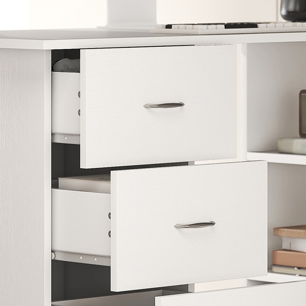- Includes 3 enclosed drawers and three open shelves for balanced storage and display