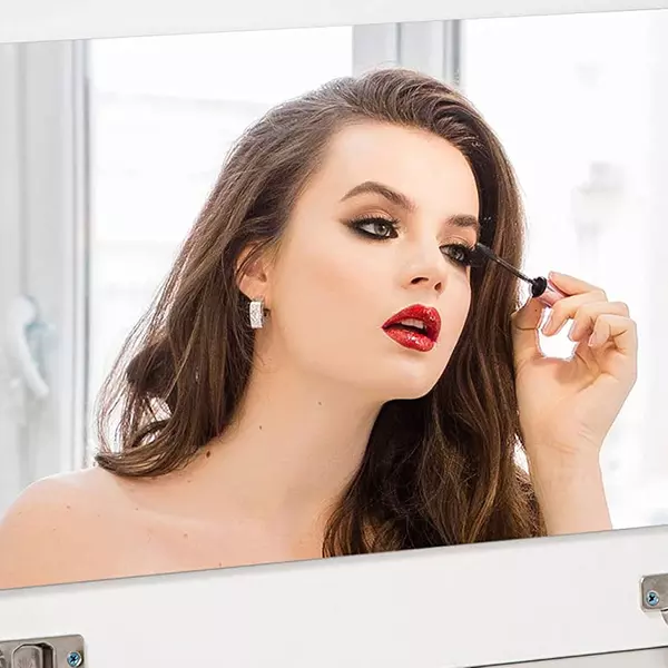 - Flip-up lid on the table reveals a mirror for easy viewing when getting ready