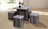 Ideal for small houses and apartments, this elegant and space-saving dining set includes a square table and four ottoman-style chairs
