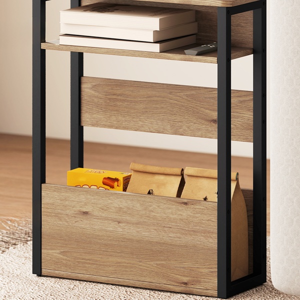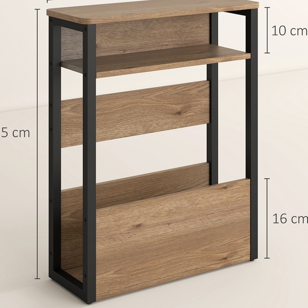 Featuring a walnut wood-effect finish and black metal frame, it offers practical storage across multiple shelves while fitting neatly into compact spaces