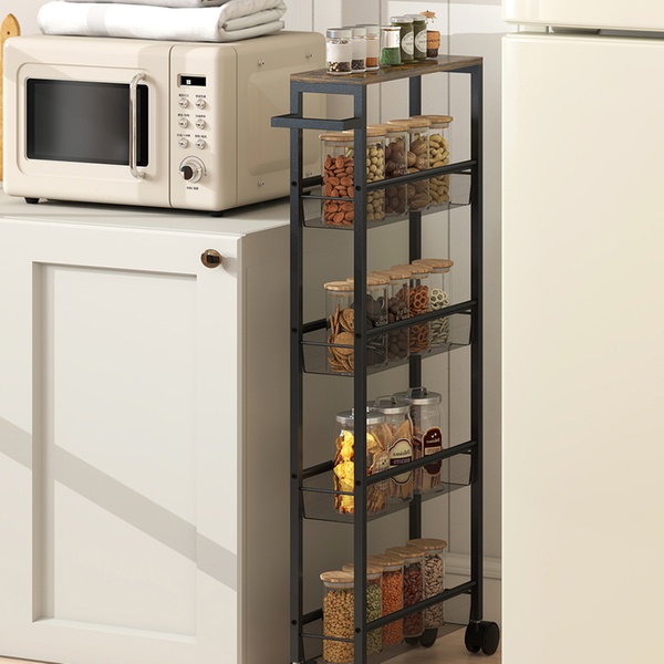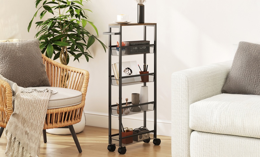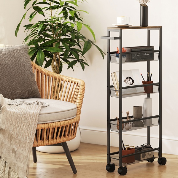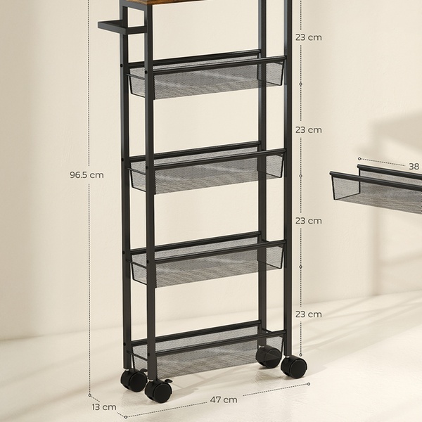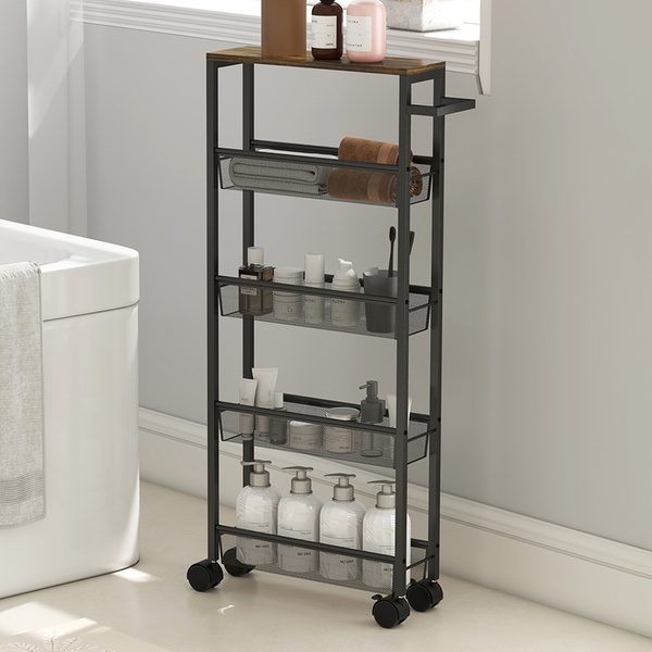 The HomCom slim 5-tier storage trolley features a space-saving 13 cm design with mesh baskets, a wood-effect top, and smooth swivel castors, making it a practical and stylish solution for organising kitchens, bathrooms, or laundry rooms