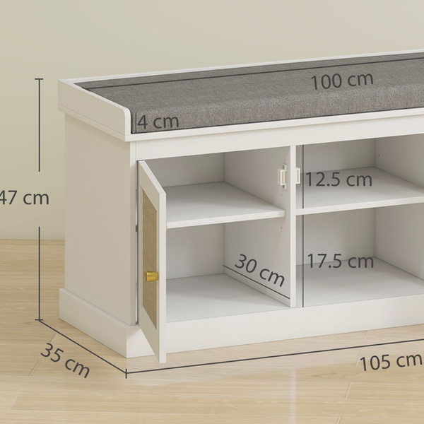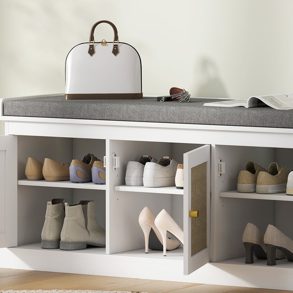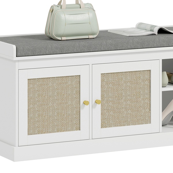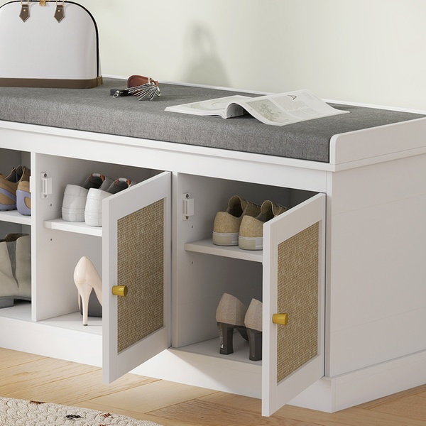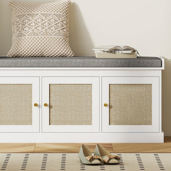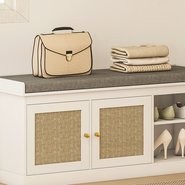 Transform any space with a chic shoe storage solution featuring stylish woven rattan-effect doors and a cosy removable cushion