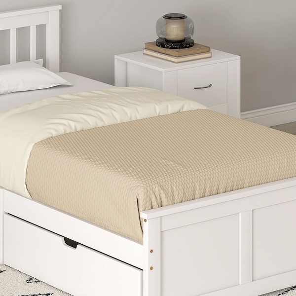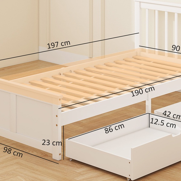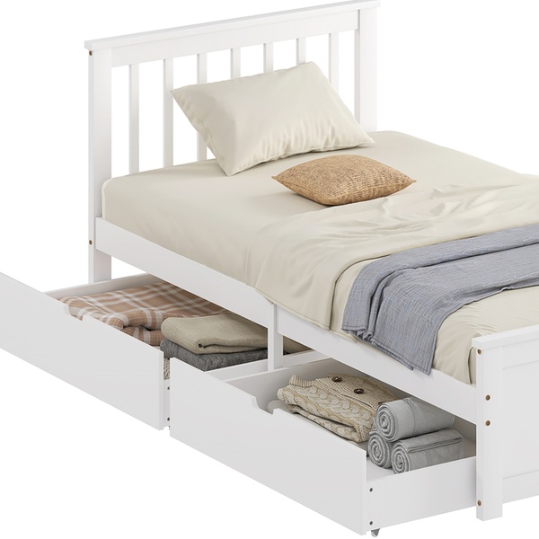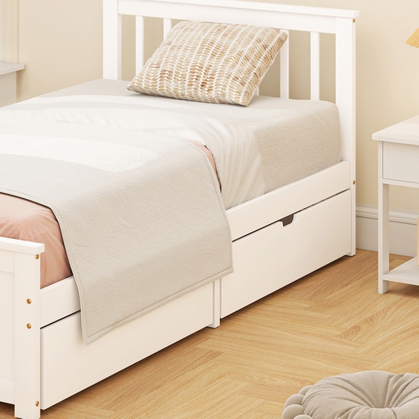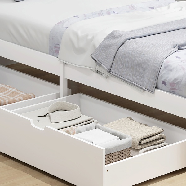 - Single bed frame with two sliding drawers for clothes, accessories, and other belongings