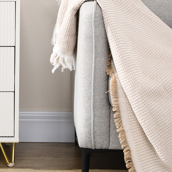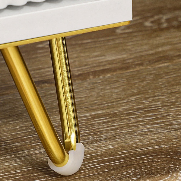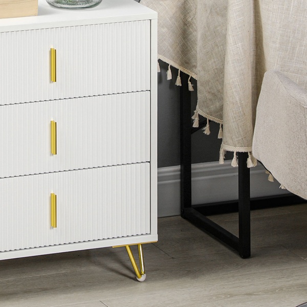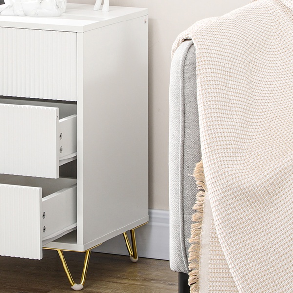 • Elegant dresser featuring a soft white finish, ridged textured drawer fronts, and gold-tone handles and hairpin legs.