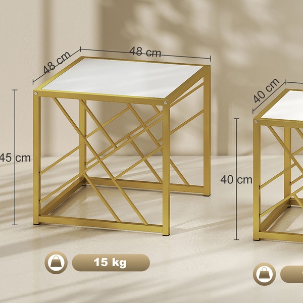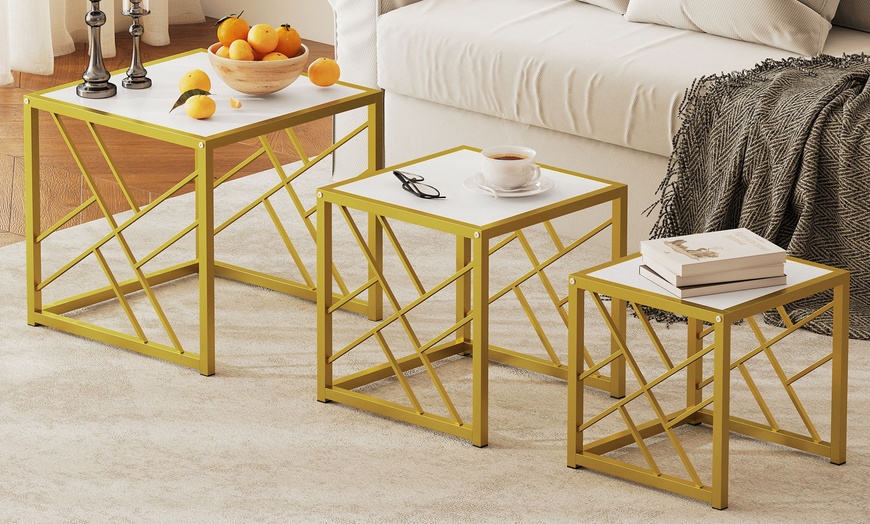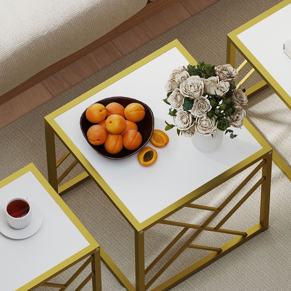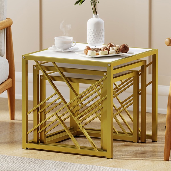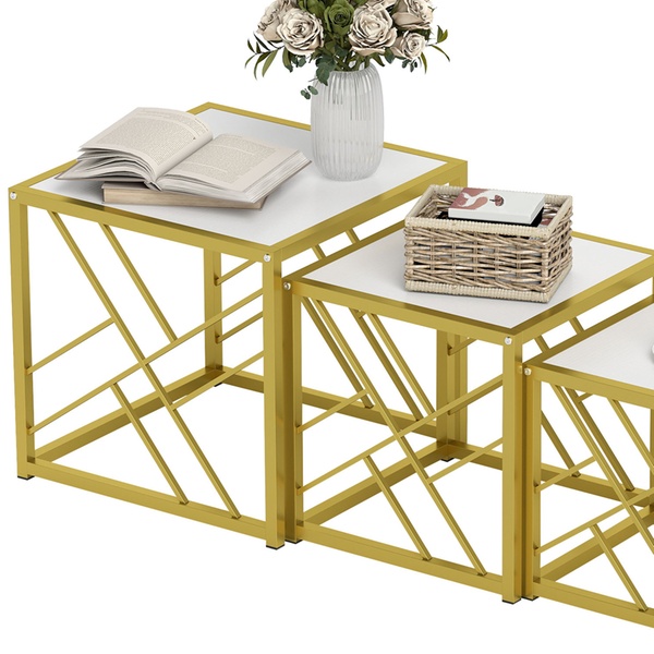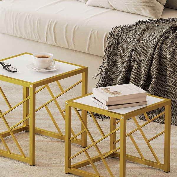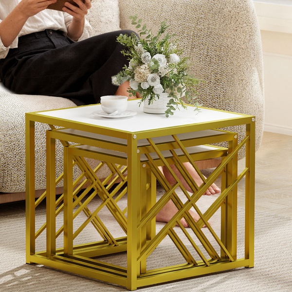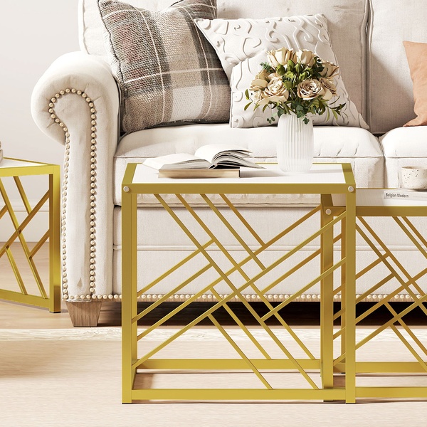 Crafted with a sturdy gold metal frame, this nesting coffee table set offers a stylish criss-cross design for a touch of elegance