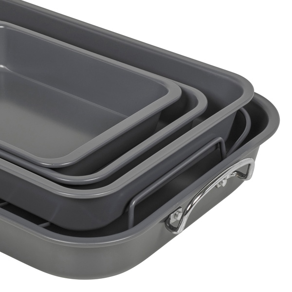 - Includes four roasting pans: 24cm x 18cm x 4.5cm, 29.5cm x 19cm x 4cm, 35cm x 25cm x 5cm, and 39cm x 29cm x 6cm, plus a roasting rack.