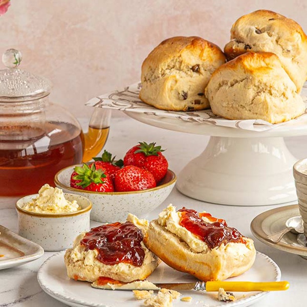 This indulgent afternoon tea includes freshly baked large scones, luscious strawberry jam and fresh clotted cream, accompanied by our all-time best selling fresh lemon drizzle cake and a carton of our much loved premium House Blend loose leaf tea pyramids as served in our own tea rooms.